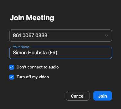 When you connect do NOT enable audio or video. You will never use audio, and video you can switch on as needed. You can test this during soundcheck (and also verify your camera angle) as you will need this skill when called by the hosts. Don’t forget to switch your video off in Zoom when you have finished soundcheck.